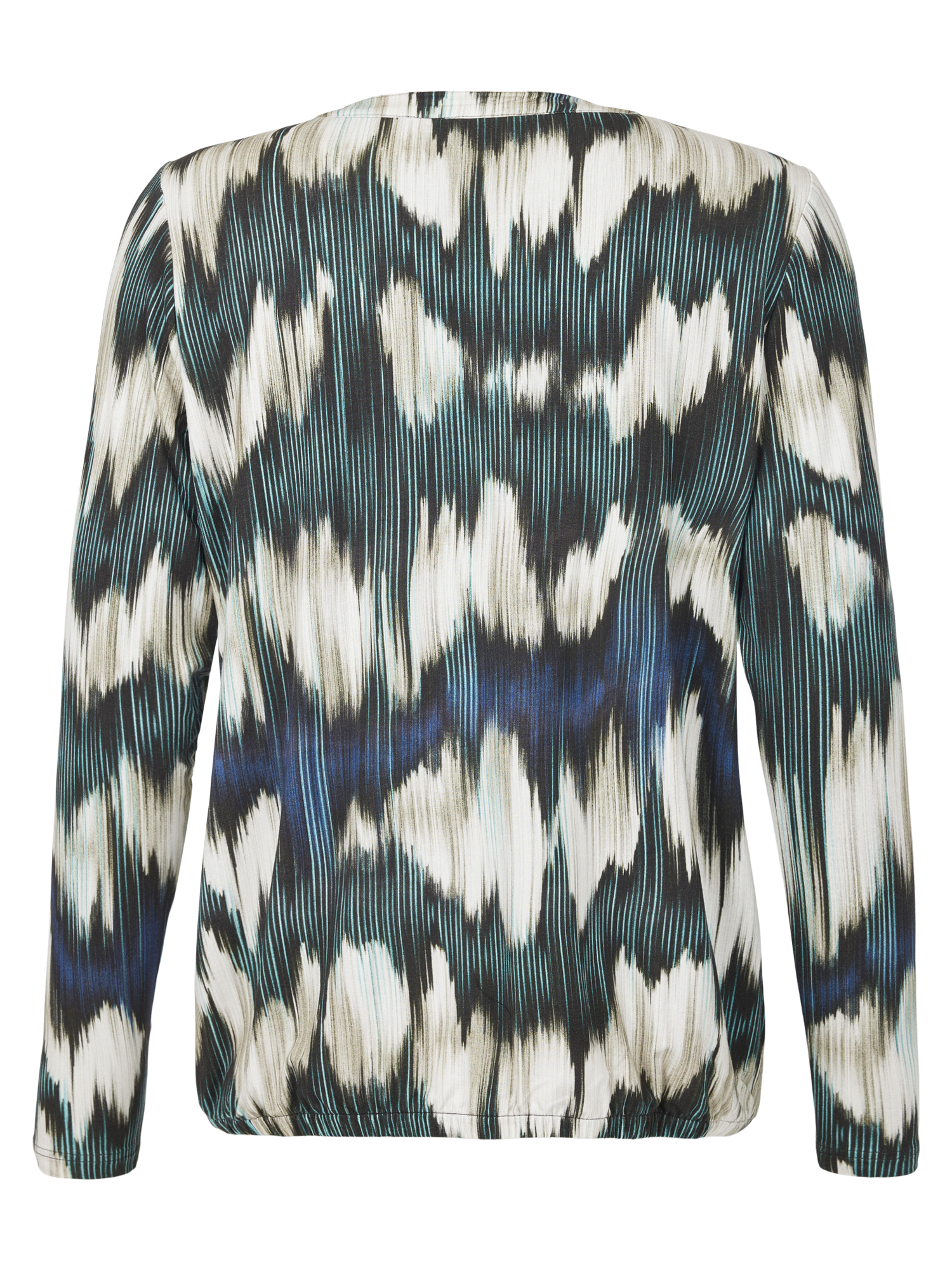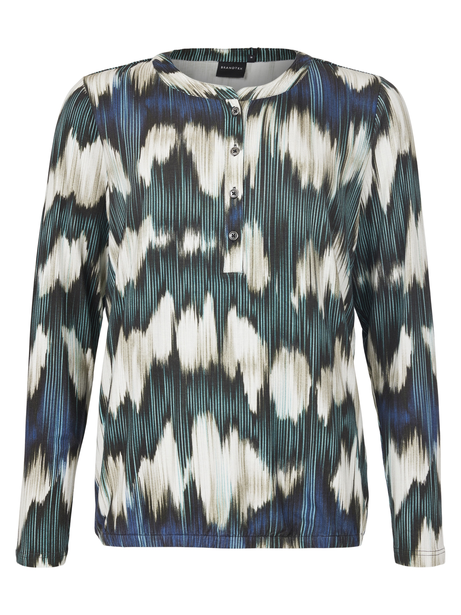 Behagelig topp med halv stolpe i front med knepping. Lange ermer og strikk nederst.