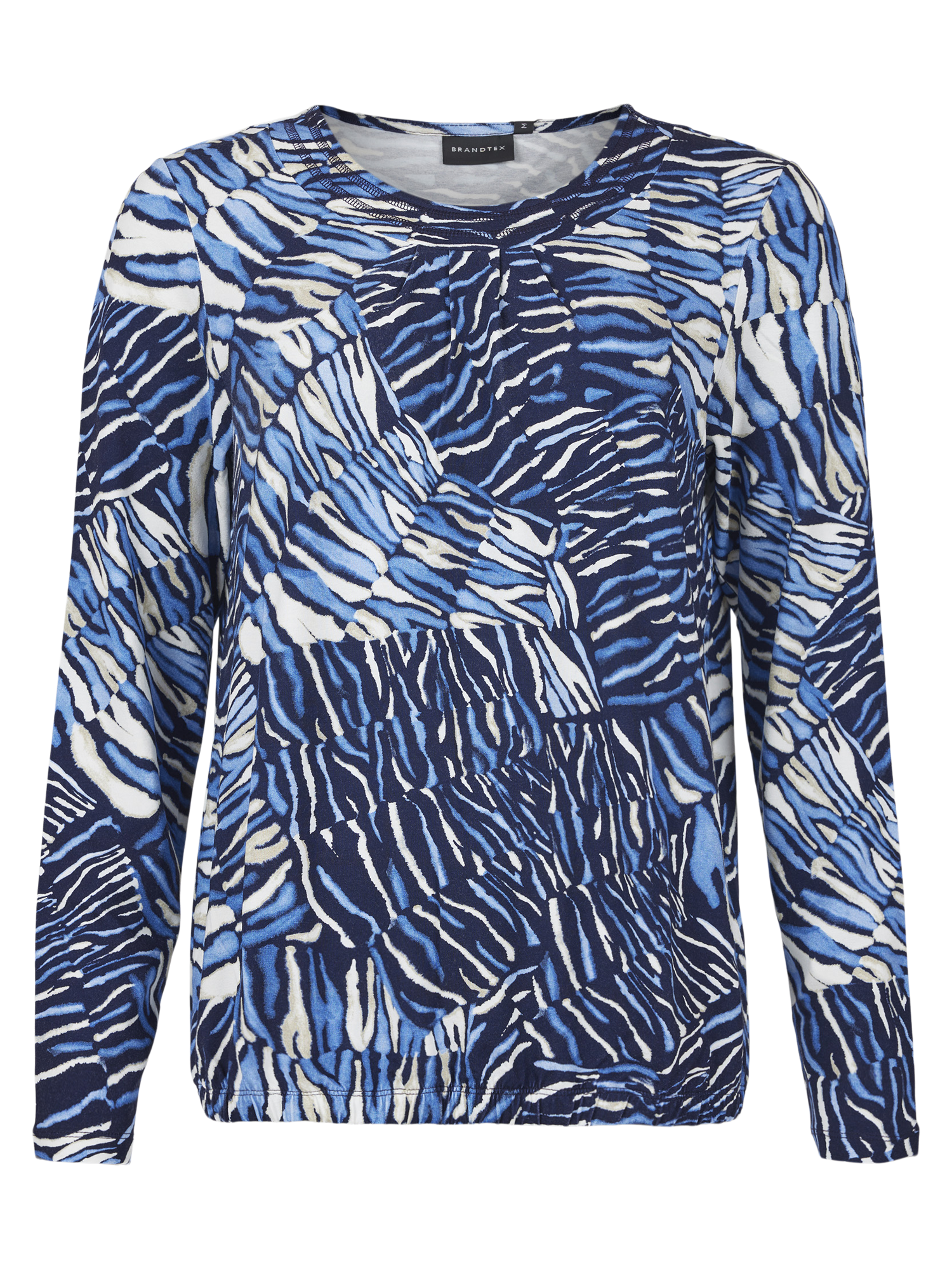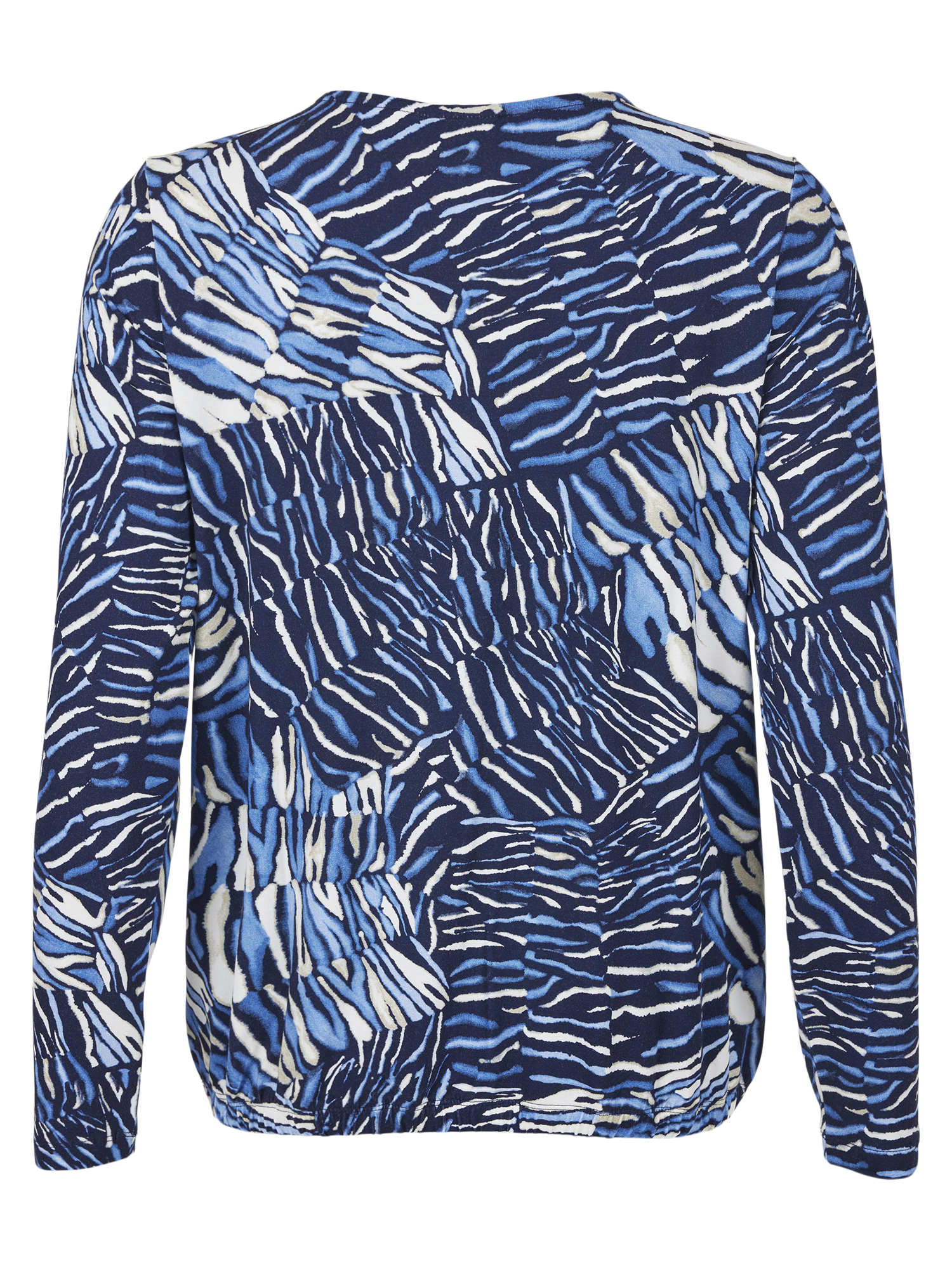 Topp med rund hals, lange ermer og strikk nederst. Mønstrete. Fargen er burgunder og sort.