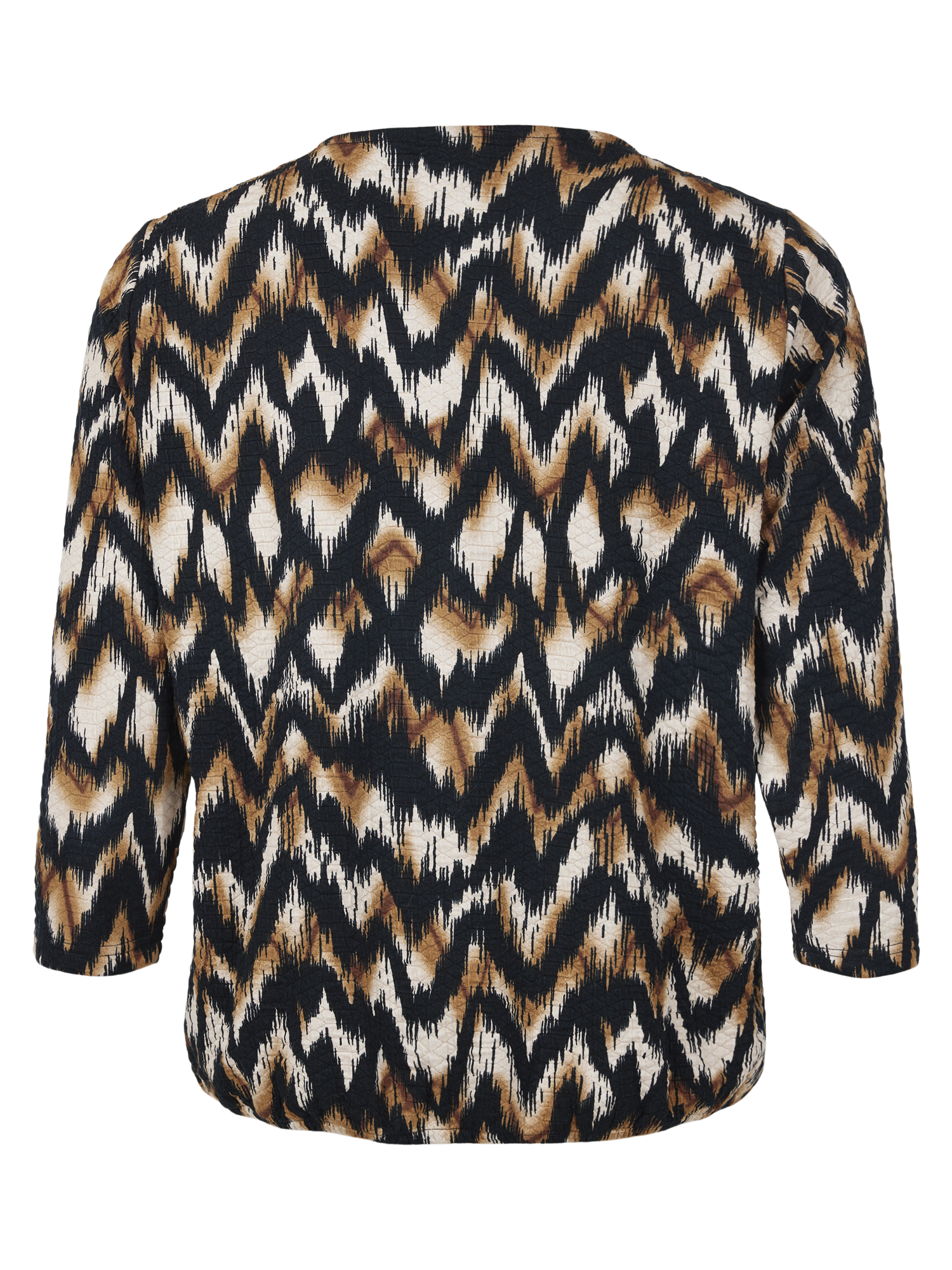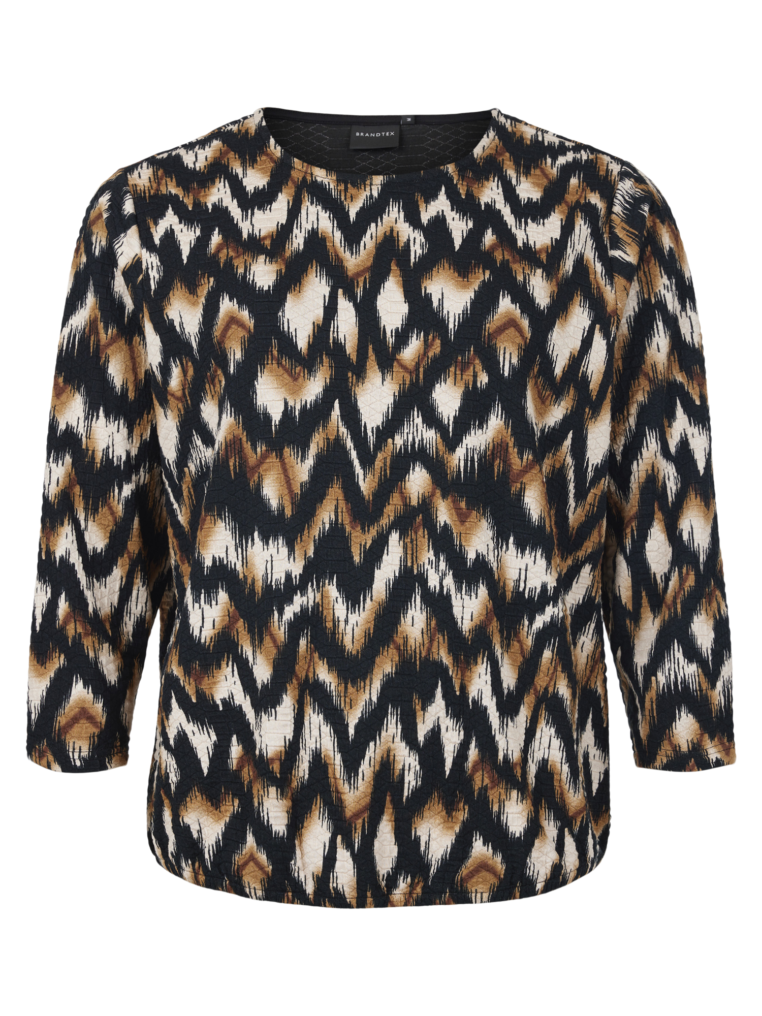 Topp med rund hals og lange ermer. 3/4 ermelengde. Det er den blå versjonen som er inne.