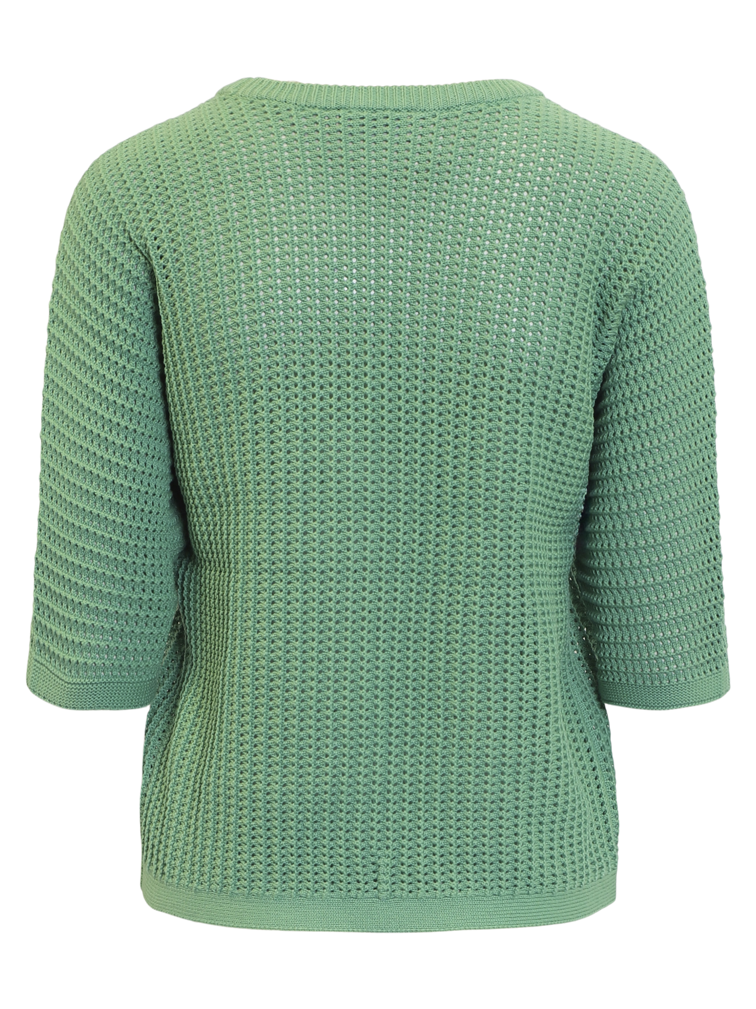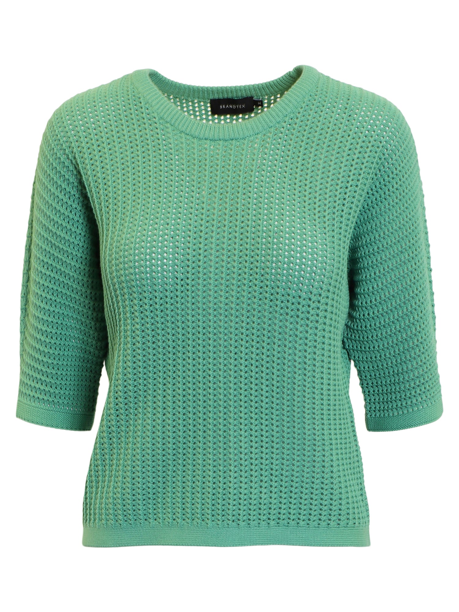 Myk strikket topp med noe hullstrikk. Korte ermer og rund hals. Ribbekant nederst, på ermet og på hals.