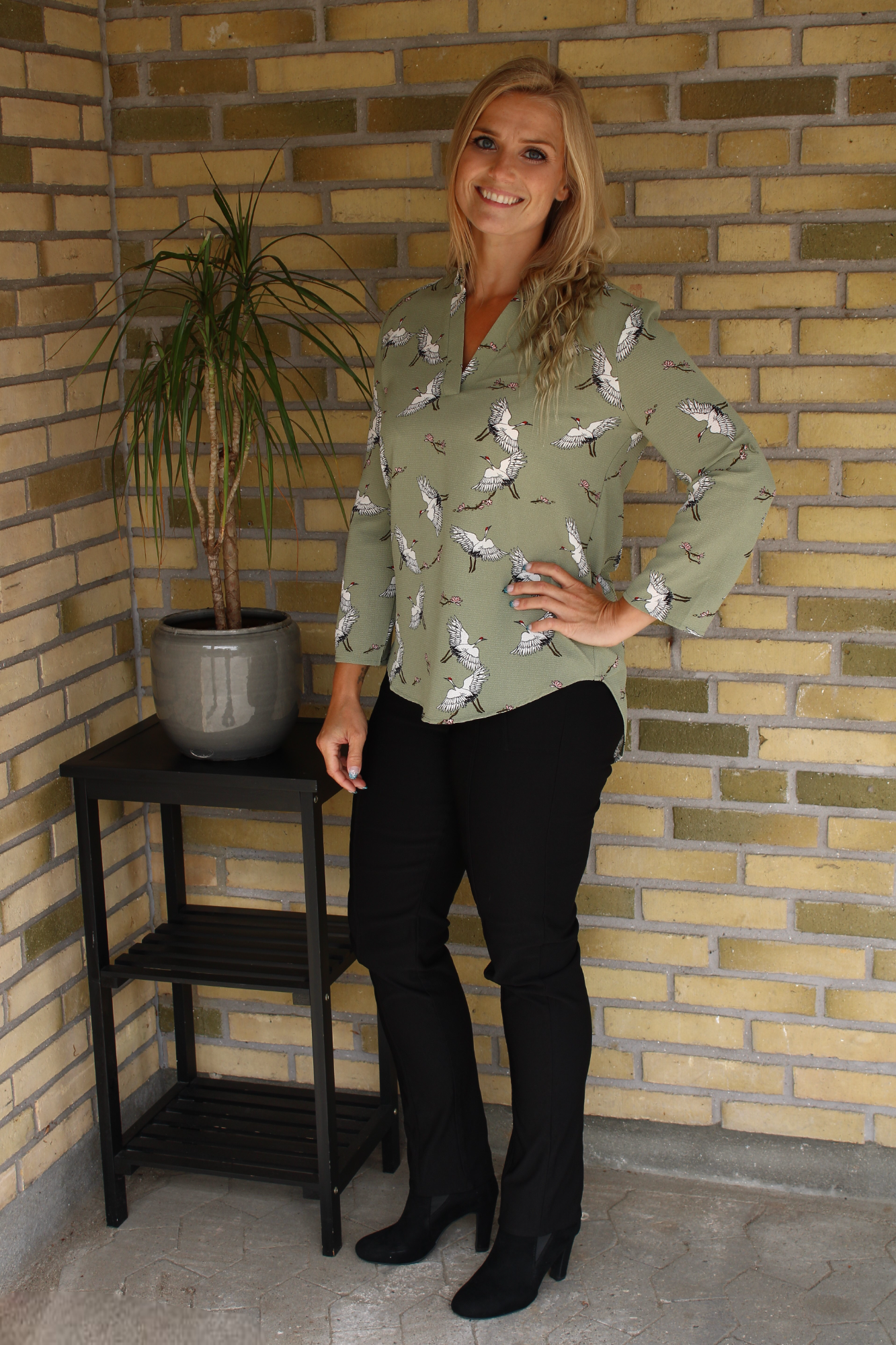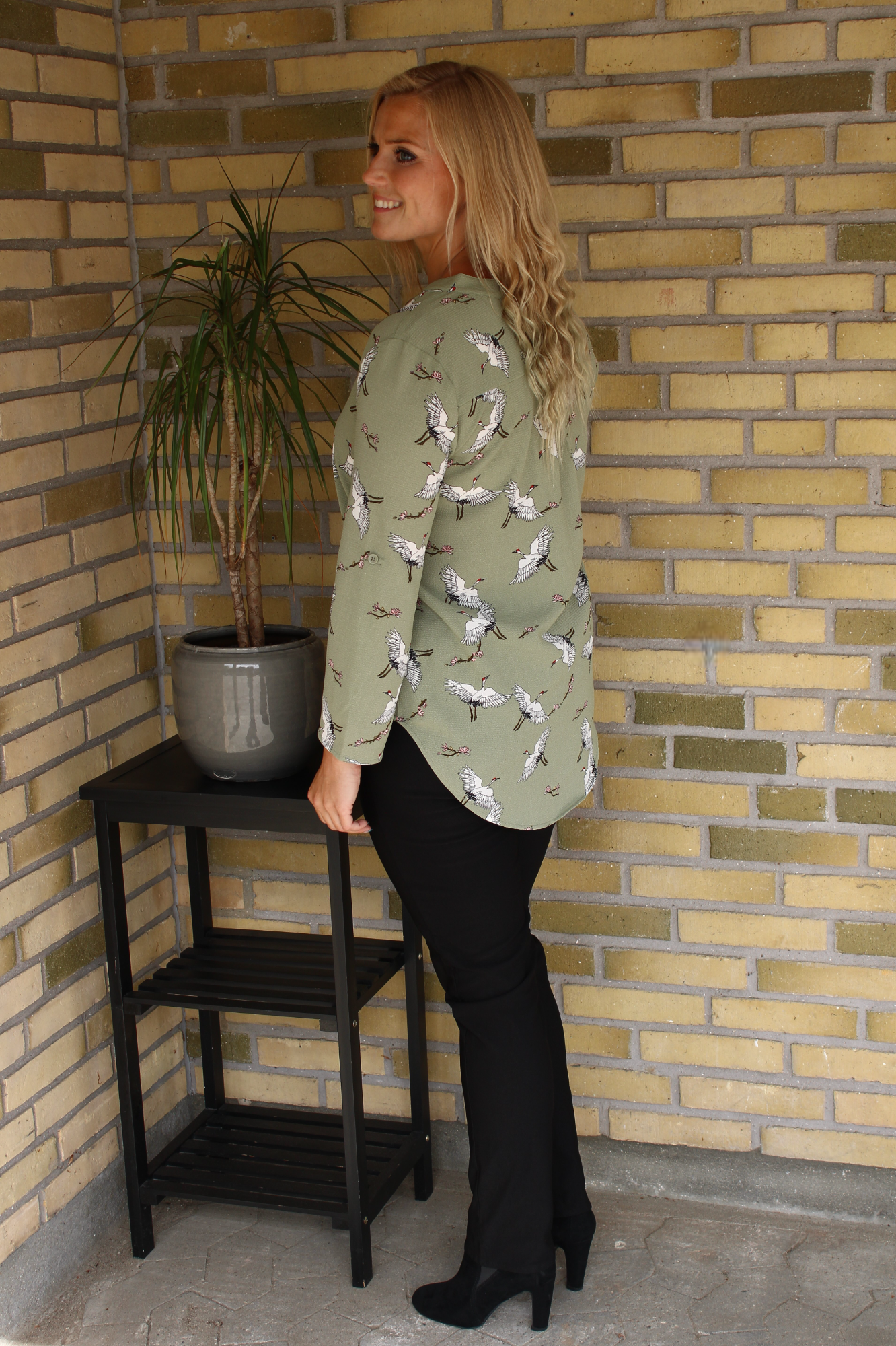 Toppen har stolpeåpning og rette ermer. Grønn med fuglemønster.