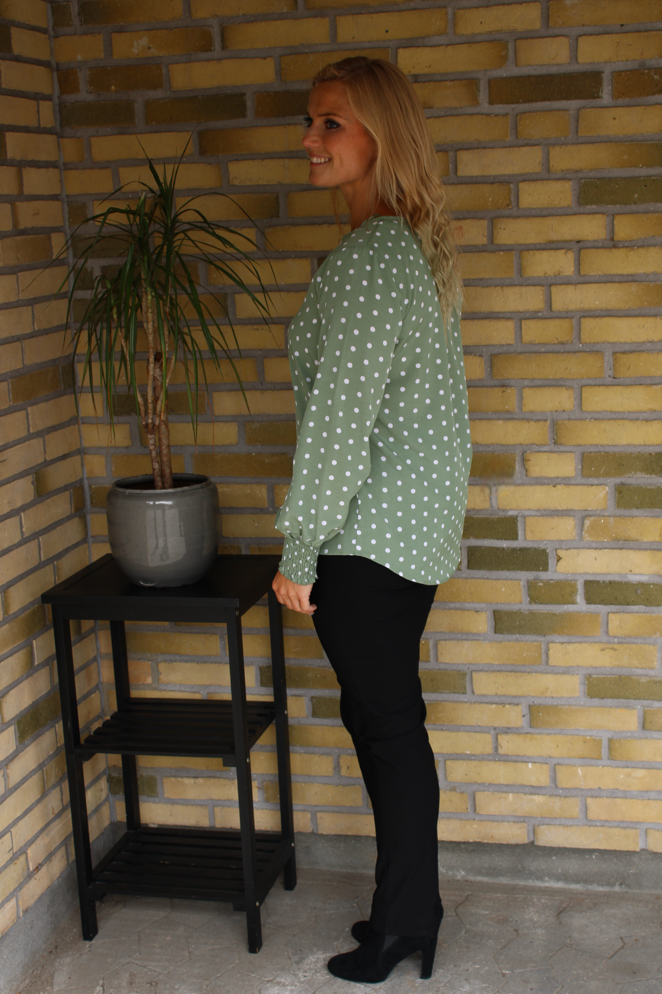 Toppen har knapp med splitt i nakken og vaffelsøm nederst på ermene. Grønn med hvite prikker.